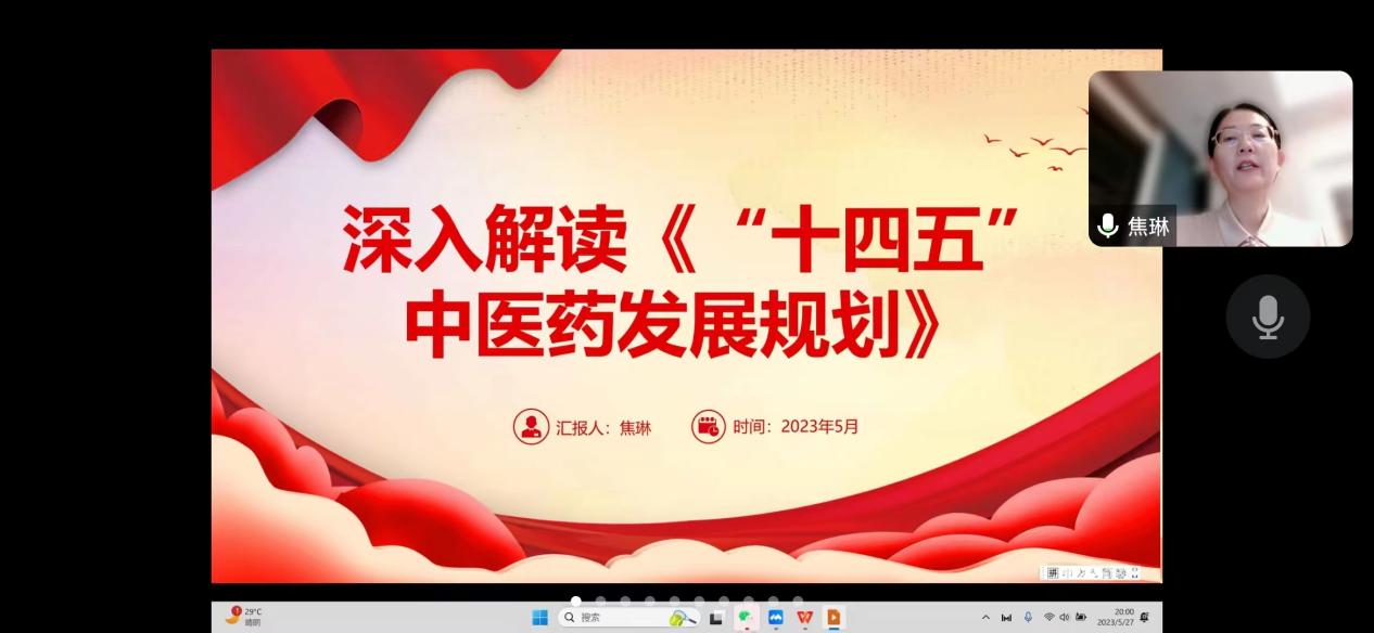 针灸推拿学院教学工作负责人从规划背景、总体要求、主要任务及强化组织实施四个方面解读了《“十四五”中医药发展规划》。结合学院师生工作和学习实际情况,重点解读了十方面重点任务,包括建设优质高效中医药服务体系,提升中医药健康服务能力,建设高素质中医药人才队伍,建设高水平中医药传承保护与科技创新体系,推动中药产业高质量发展,发展中医药健康服务业,推动中医药文化繁荣发展,加快中医药开放发展,深化中医药领域改革以及强化中医药发展支撑保障。最后,针灸推拿学院教学工作负责人强调大家要深入学习贯彻习近平总书记关于中医药工作的重要论述,坚定文化自信,遵循中医药发展规律,传承精华,守正创新,推动中医药振兴发展。