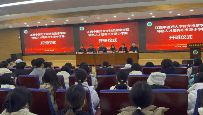 江中新闻网讯(通讯员 曹颖 太宇星 赵怡坤)寒冬时节,学风渐浓。1月9日,针灸推拿学院2025-2026学年热敏灸产业学院、灵枢大医班、针灸康复一体化技能培训早临床实践班等特色人才班冬季小学期开班仪式在图书馆学术报告厅隆重举行。学校党委委员、副校长周志刚教授,党委委员、副校长钟凌云教授出席开班仪式。针灸推拿学院领导班子、针灸推拿学院教师以及各特色人才班全体学员共同参与。
