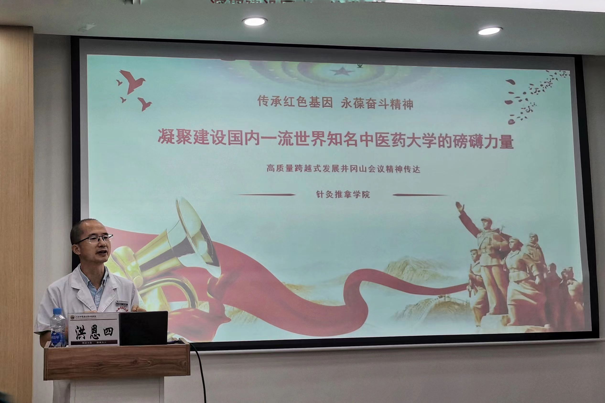 江中行舟,不进则退,学科强则学院强,学院强则学校强。最后,洪恩四书记、周志刚院长强调,此次高质量跨越式发展井冈山会议是一次传承红色基因,永葆奋斗青春,凝聚建设国内一流世界知名中医药大学的磅礴力量的大会,我院全体职工要以“功成不必在我”的精神,“功成必定有我”的历史担当,积极融入到学校双一流建设之中,全力助推学校双一流建设。